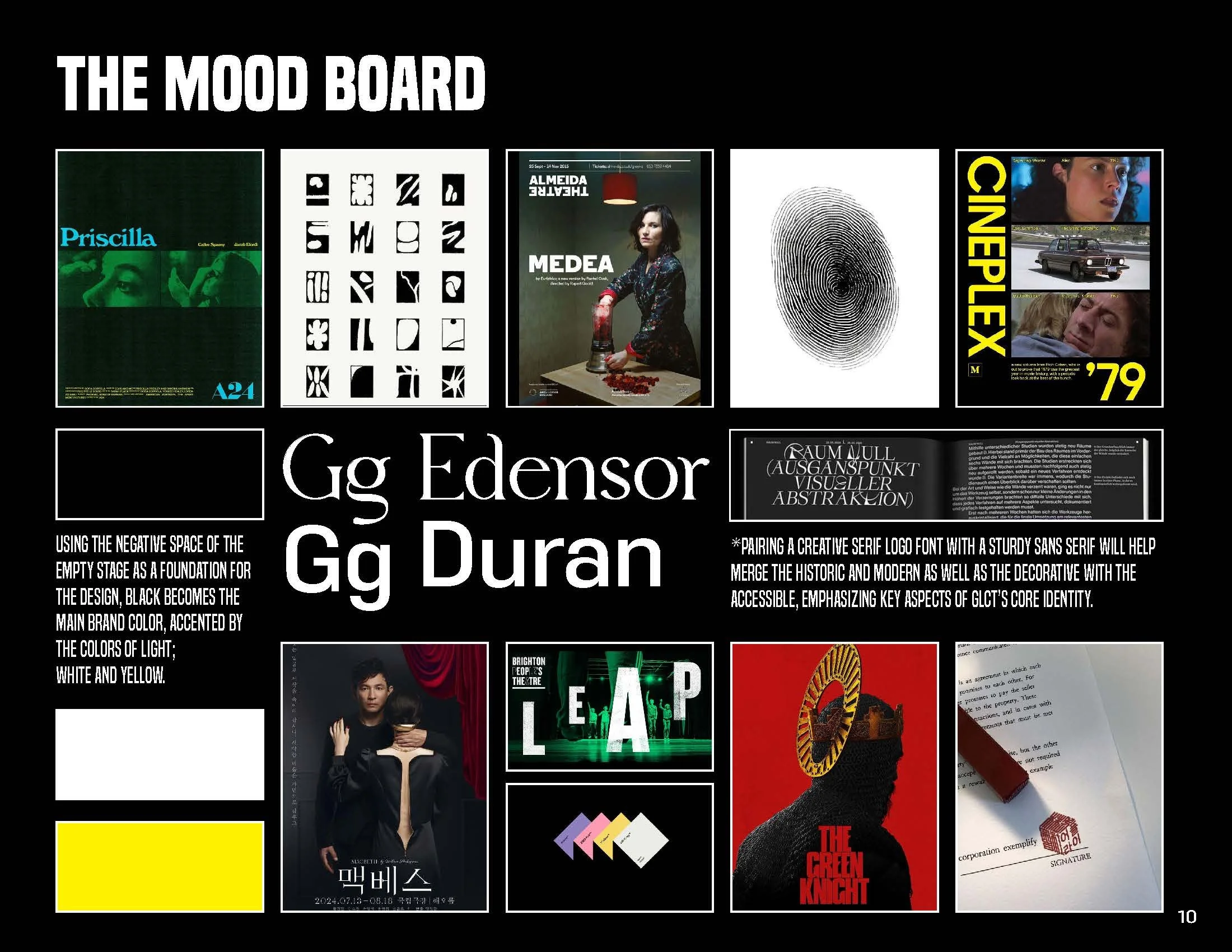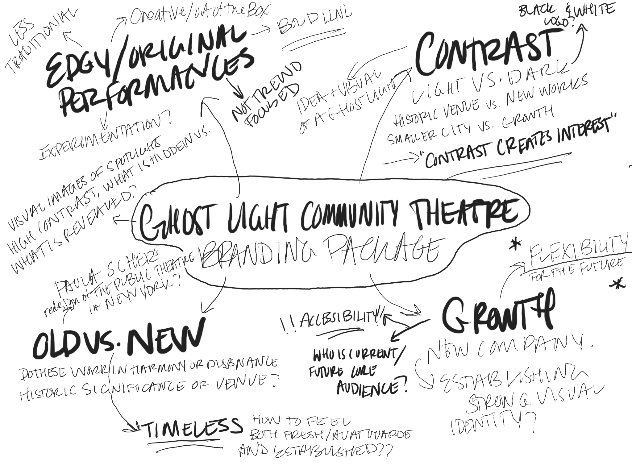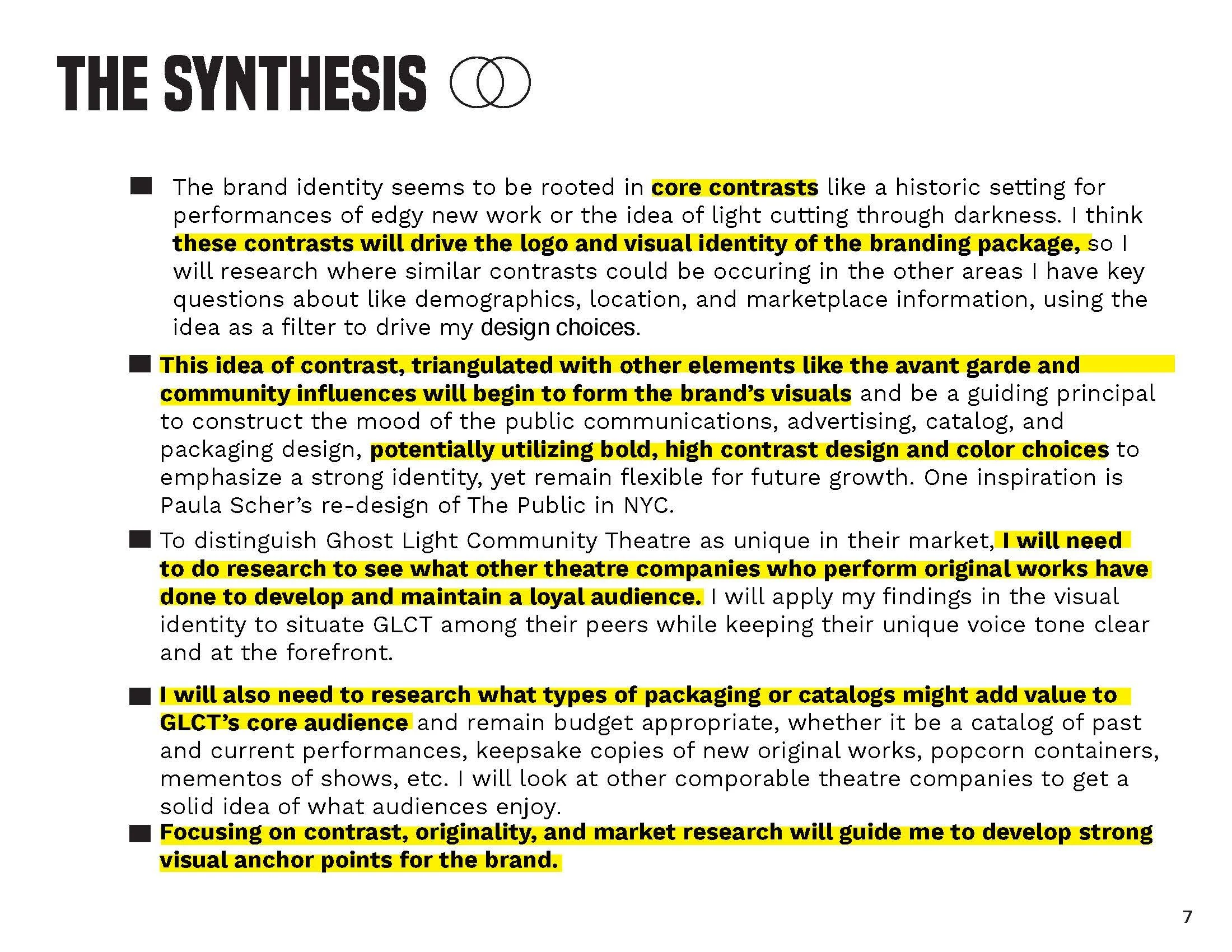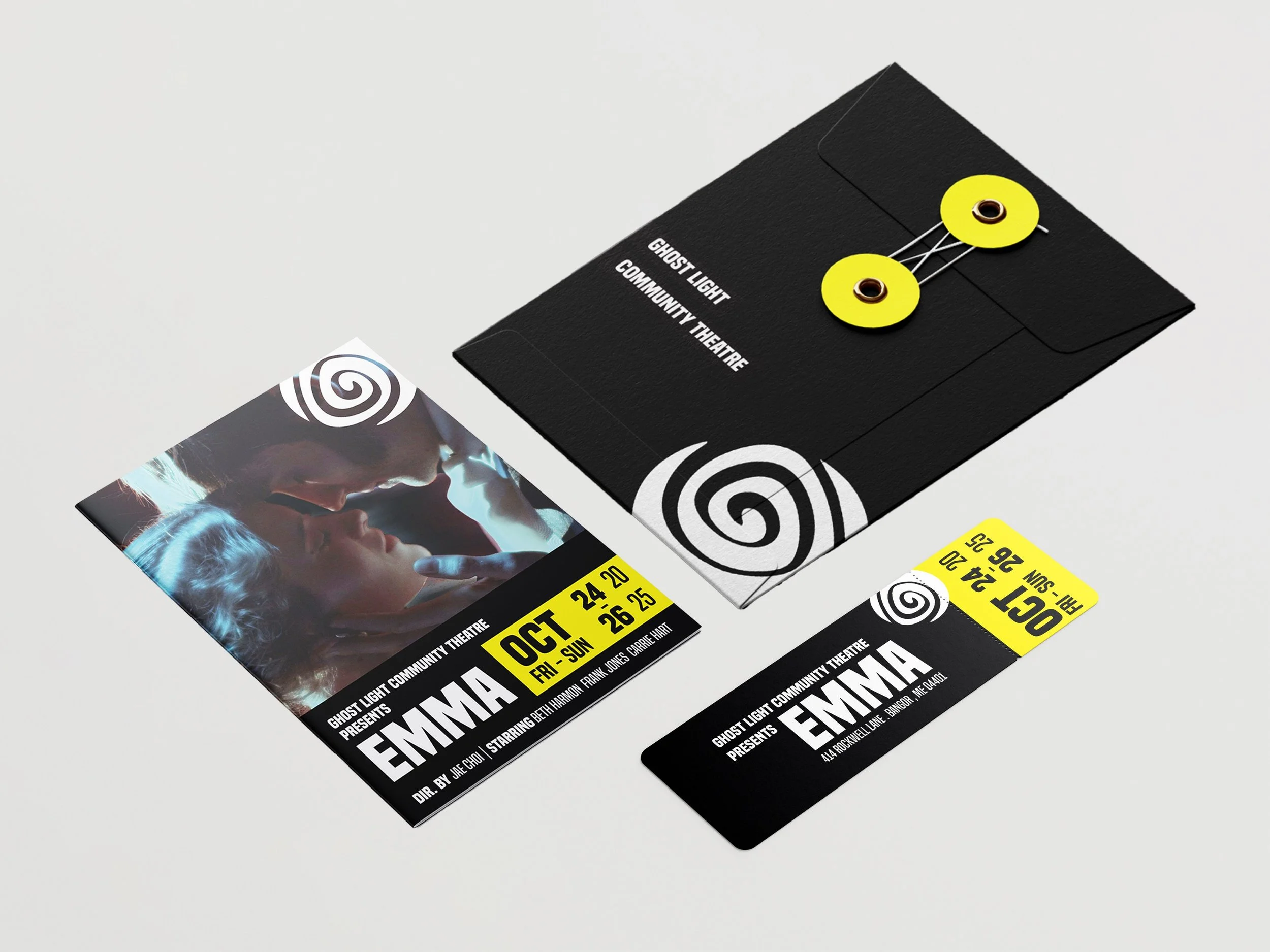 The project’s design launched from the theatre’s existing name and tagline. A “ghost light” is the single bare bulb left on stage to illuminate a theatre and orchestra pit for the safety of production crew who work before house lights are turned on. This visual, accompanied by the theatre’s tagline “theatre is a light that shines in the darkness” inspired me to work in a limited color palette, black, white, and yellow and use negative space to represent light piercing through darkness throughout the overall design.